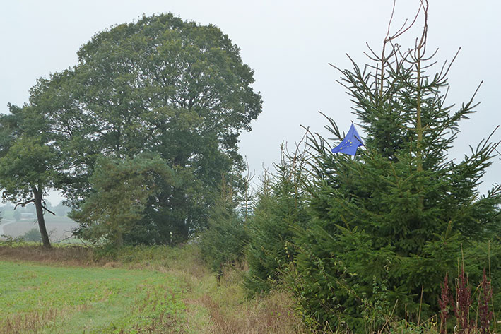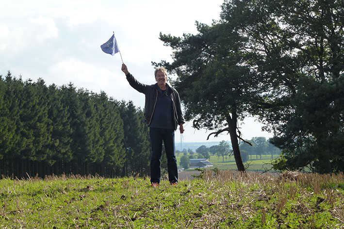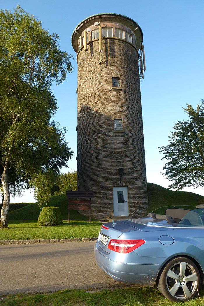 Vom Mont Blanc zum Kneiff. Wohin bitte? Zum Kneiff! Der Routenplaner erkennt den Berg und gibt mir folgende Strecke vor: von Chamonix 726 km durch das schöne Frankreich bis nach Ulflingen. Dortganz im Norden von Luxemburg bereits in den Ardennen, ist der Kneiff. Mit 560 m die höchste Erhebung Luxemburgs. In Ulflingen angekommen, stoße ich gleich auf einen Wasserturm, der mit „Burrigplatz Point Culminant du Grand – Duche“, 558,35 m gekennzeichnet ist. Lange Zeit galt er als der Höchste Luxemburgs, bis etwa einen KM vom Burrigplatz der Hügel Kneiff per Satellit entdeckt bzw. vermessen wurde. Während auf dem Burrigplatz ein schönes Restaurant zum Gipfelschmaus einlädt, ist der Kneiff (Wiese und Wäldchen) touristisch nicht erschlossen. Dafür steckt jetzt die Europafahne an seinem Gipfelstein und bereichert die Gipfelwiese.
