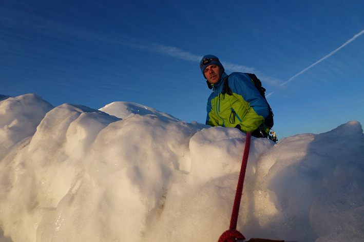 Wir sind zu viert, teilen uns in zwei Seilschaften auf, da immer nur zwei mit einem Bergführer gehen können. Unser Guide heißt Sebastian, ein junger Student aus Aalen, für den das Bergsteigen eine große Leidenschaft ist und er sich großartig auskennt. Wir brechen früh auf. Es ist verdammt nebelig. Unsere Steigeisen enttäuschen uns nicht. Selbst auf extrem steilen, schmalen Graden und schlechter Sicht trotz Stirnlampen, kommen wir gut voran. Das Wetter wird zusehends schlechter. Ob wir es bis zum Gipfel schaffen? Gerade, als wir die Vallothütte auf 4.362 Meter erreichen, beginnt es zu graupeln. Die Hütte ist eine etwas größere Biwakschachtel, in der schon einige Wanderer übernachtet haben. Aufgrund des Wettersturzes drängen die Bergsteiger von unten und oben kommend massiv in den Unterschlupf. Soweit es machbar ist, checked Sebastian draussen die Lage. 20 Minuten später, die Hütte ist mittlerweile brechend voll, kehrt er zurück. Klare Ansage, frei nach unserem Größten, Reinhold Messner: abbrechen und runter. 440 Meter unter dem Gipfel umkehren. Ein harter Schlag für uns. Enttäuscht tasten wir uns bei Sichtweite von wenigen Zentimetern abwärts, bis wir die Goûter