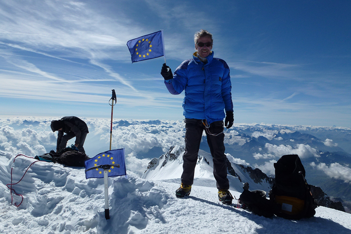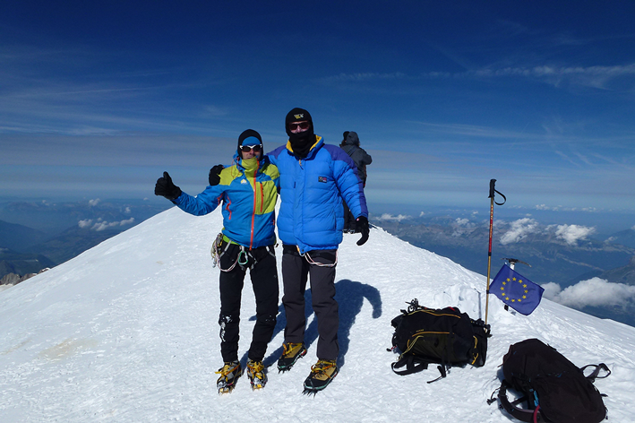 Die Wettervorhersagen sind glänzend. Wir fahren nachmittags mit der Seilbahn zum du Midi, dann geht es auf schmalem Grat 200 Höhenmeter runter zur Cosmiques Hütte auf 3.613 m. Wir treffen dort nur wenige Bergsteiger. Kein Wunder nach dem Drama vor einem Monat. Wir gehen früh schlafen, um für den Tag der Tage fit zu sein. Um 3 Uhr geht’s los, mit voller Energie bei minus 10 Grad. Hácek kennt den Weg und wir kommen gut voran. Punkt 6 Uhr erleben wir das Naturspektakel der aufgehenden Sonne. Fantastisch! Mehrfach müssen wir im Eis vertikal klettern. An der Unglücksstelle am Mont Maudit legen wir eine Gedenkminute ein. Ein japanisches Paar kommt hinzu, dann geht’s weiter Richtung Gipfel. Es wird immer anstrengender, doch auf einmal haben wir es geschafft. Wir sind oben, on the TOP, um genau 10.22 Uhr. Die Glücksgefühle sind unbeschreiblich. Von der Erschöpfung ist nichts mehr zu spüren. Wir springen auf dem Gipfel hin und her, von Frankreich nach Italien, vom Monte Bianco auf den Mont Blanc, dem höchsten Summit der Europäischen Union. Wir sind glücklich und hissen die EU Flagge. Drei russische Bergsteiger sind von unserer Hüpferei so begeistert, dass sie mitmachen und laut rufen „Мы также хотим в ЕС“ - wir (Russland) wollen auch in die EU“. Der Abstieg auf dem sonnigen und luftigen Bossegrat macht richtig Spaß. Wir sind durstig und hungrig. Wir immer ist die Gôuter Hütte voll und wir müssen uns gedulden, bis wir die Refuge de Tête Rousse, 3.167 m erreicht haben. Wir verbringen die Nacht dort und steigen am nächsten Tag, am 15. August, nach Chamonix ab und feiern unseren Gipfelerfolg. In Italien ist Ferragosta mit riesigem Feuerwerk, in Frankreich ein spektakuläres Theaterstück im Fels mit Tanz und Musik.