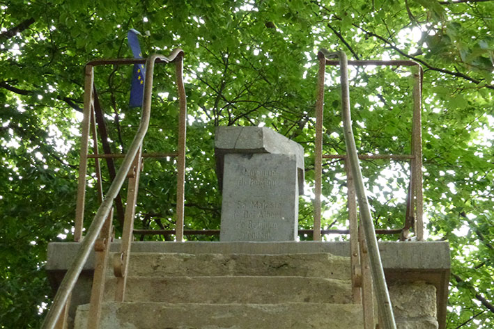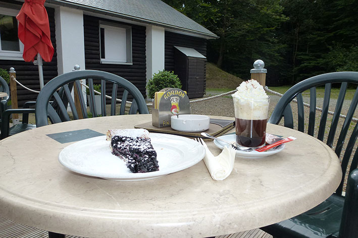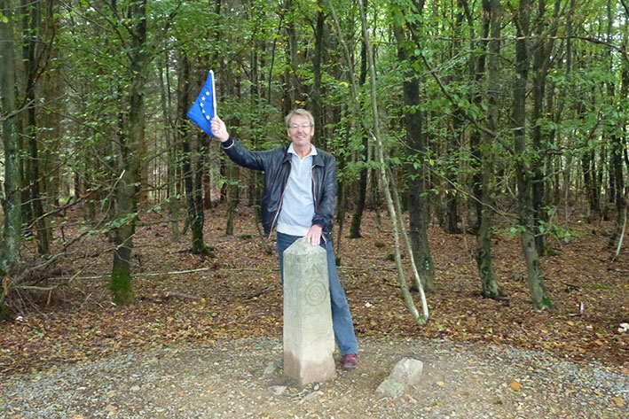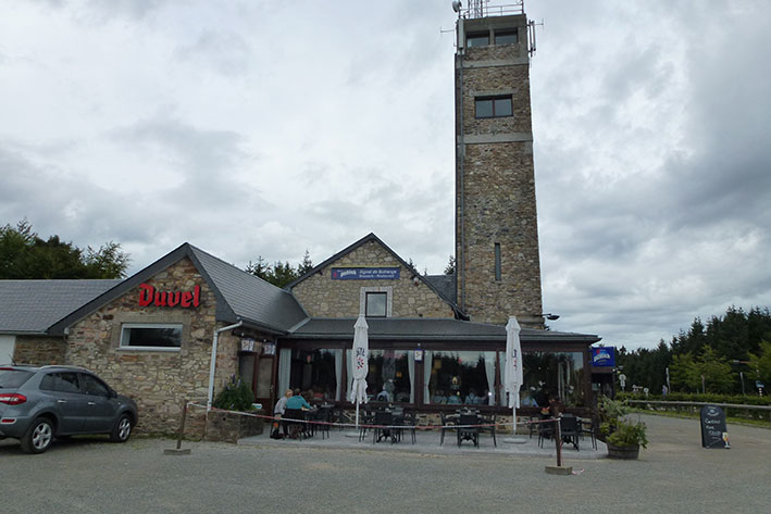 Weiter geht’s in den Ardennen zum Signal de Botrange, mit 694 m der höchste Berg Belgiens. Er ist direkt mit dem Auto zu erreichen, durch die hübsche Stadt Malmedy, rauf zum „Gipfel“ wo man von einem Turm mit Cafe und Restaurant empfangen wird. Täglich kommen hier viele Leute an, lassen sich am höchsten Punkt Belgiens – jetzt auch mit EU Flagge – fotografieren und wandern durch Wald und Wiese mit rundum Ausblicken. Da den Belgiern die 694 m wohl zu wenig waren, hat König Albert neben dem Gipfelstein eine massive Betontreppe mit 6 m Höhe gebaut, so dass Belgien nun eine „Altitude von 700,00„