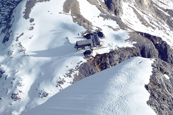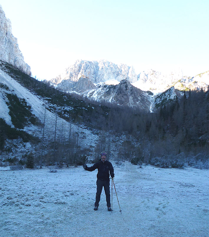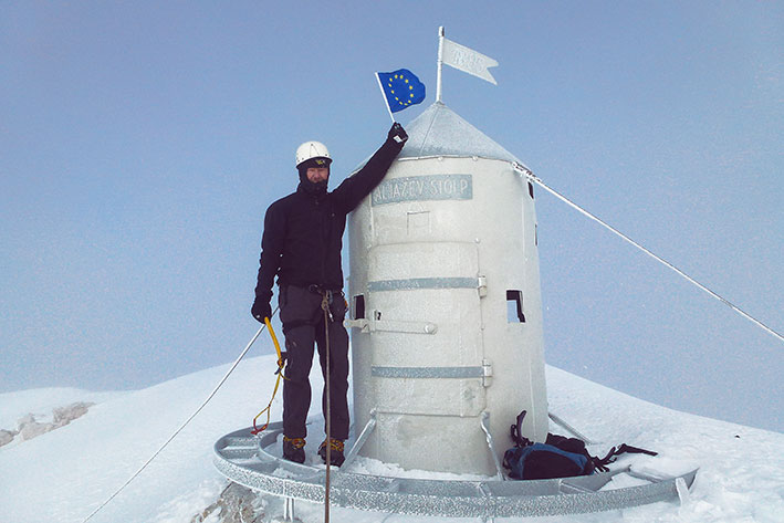 Mitja, mein Bergführer, und ich starten in Mojstrana. Zunächst fahren wir mit dem Auto ins Krma-Tal. Von da beginnt unsere lange Wanderung, 1.800 Höhenmeter sind es zum Triglavski Dom (2.515 m). In dieser Hütte ist auch eine Wetterstation untergebracht und die Wetterleute übernehmen im Winter die Bewirtschaftung der Hütte. Wir wandern auf einer Via Ferrata weiter, 350 Höhenmeter zum Gipfel. Wie erwartet ist der Klettersteig mit all seinen Eisenklammern, Seilen und Haltebolzen zugeschneit, so dass wir mit Eishacke, Steigeisen und Seil auf den Gipfel stiegen. Aus dem leichten Kletterberg Triglav wird anspruchsvolles Klettern in Eis und Fels. Oben angekommen, bietet uns der Gipfelturm Aljaz (Aljazev stolp) Unterschlupf vor dem heranziehenden dichten Nebel. Den Turm schmücken wir mit der EU-Flagge und schaffen so ein weiteres wichtiges Landessymbol.