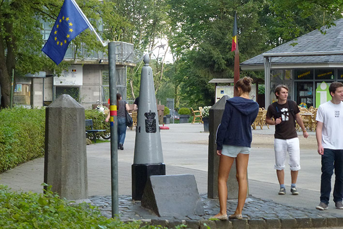 „HOOGSTE PUNT VAN NEDERLAND 322,5 MTR. BOVEN A.P.“, wie auf dem Gipfelstein steht. Doch seit dem 10. Oktober 2010 ist er nicht mehr der Höchste der Niederlande. Seit diesem Tag ist es Mount Scenery mit 877 m, ein Vulkan auf der Karibikinsel Saba. Aber, Saba - die „Besondere Gemeinde“ der Niederlande - gehört nicht zur Europäischen Union. Und damit bleibt der Vaalserberg ein EU 28 Summit. Ja, der Vaalserberg hat eine lange Geschichte: Von 1839 bis 1919 war er mit dem strittigen Gebiet Neutral Moresnet als viertem Land sogar ein Vierländereck. Heute ist er „Drielandenpunt“,umgeben von Aachen (D), Vaals (NL) und Lüttich (B) und eine richtige Touristenattraktion. Zwei Aussichtstürme, Restaurants, ein Vergnügungspark, ein Kinderspielplatz und ein wunderschöner Hecken-Irrgarten (Labyrinth) konnte ich auf dem Berg bestaunen. Fehlte nur noch die EU Flagge. Also hisste ich sie am Gipfelstein. Voller Freude konnte ich sehen, wie die Turmleitung sie danach sogar auf die Turmspitze befördert hat.